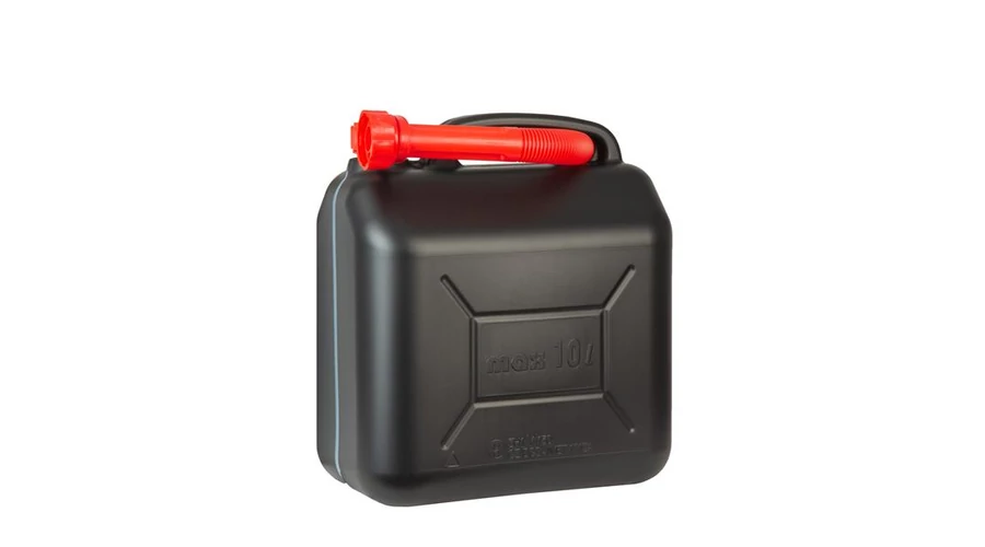 10 liter űrtartalmú üzemanyag kanna piros színű kupakkal és tölcsérrel. A kanna alapszíne fekete, anyaga pedig műanyag.