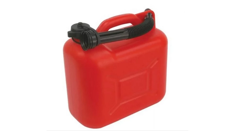5 liter űrtartalmú üzemanyag kanna fekete színű kupakkal és tölcsérrel. A kanna alapszíne piros, anyaga pedig műanyag.