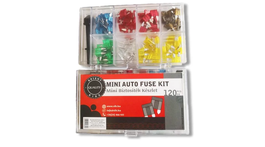 Mini késes biztosíték készlet műanyag több fakkos dobozban. A doboz aksztható.