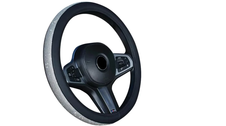Kormányvédő | strasszköves | fekete bőr szegéllyel | ezüst | 38 cm