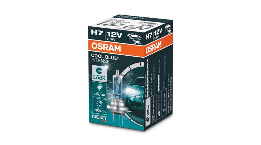 Az Osram H7 Cool Blue Intense NextGen +100% halogénizzó elhozza autódba a LED-es fényforrásokhoz legközelebb álló ragyogó fehér fényt! Az 5000K, hidegfehér fényű Cool Blue Intense NextGen halogén által kibocsátott fény egyes pontokon a standard izzóknál akár 100%-kal világosabb.
